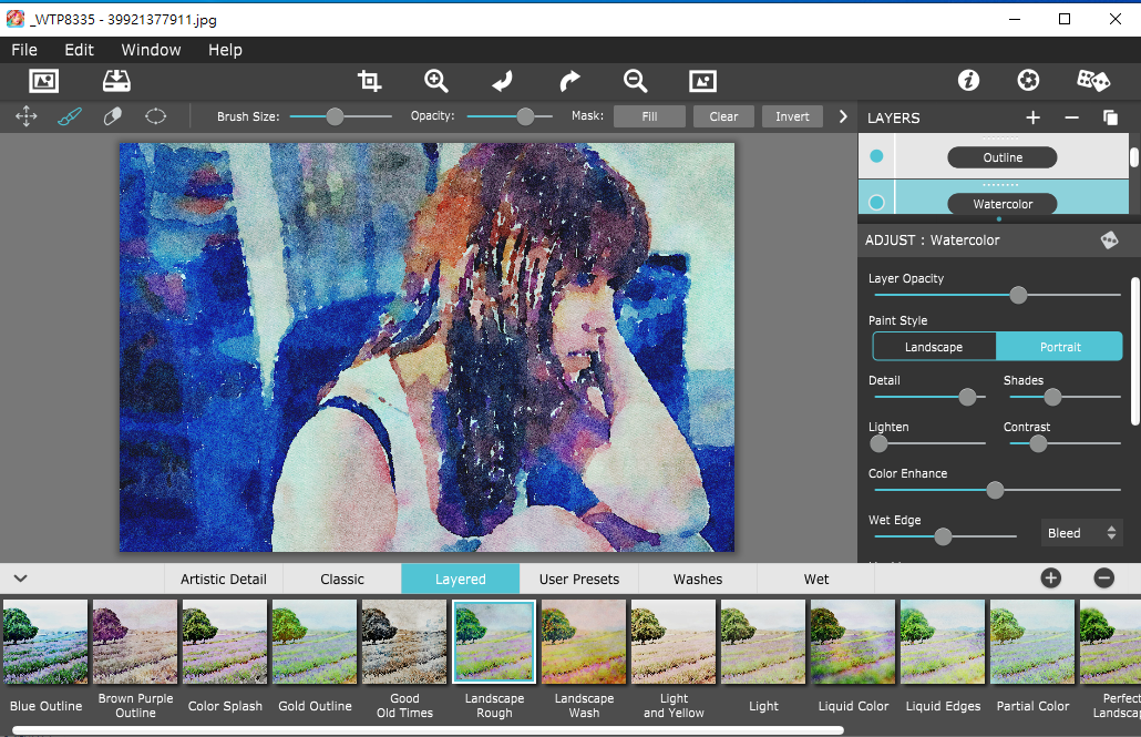 - 提供多種預設水彩效果,使用者可以從中選取或進一步自訂,以便快速建立所