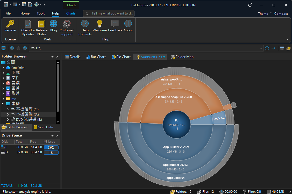 能以圖形和數據報表的方式展示資料夾和檔案的大小,幫助快速識別儲存空間的使用情況。